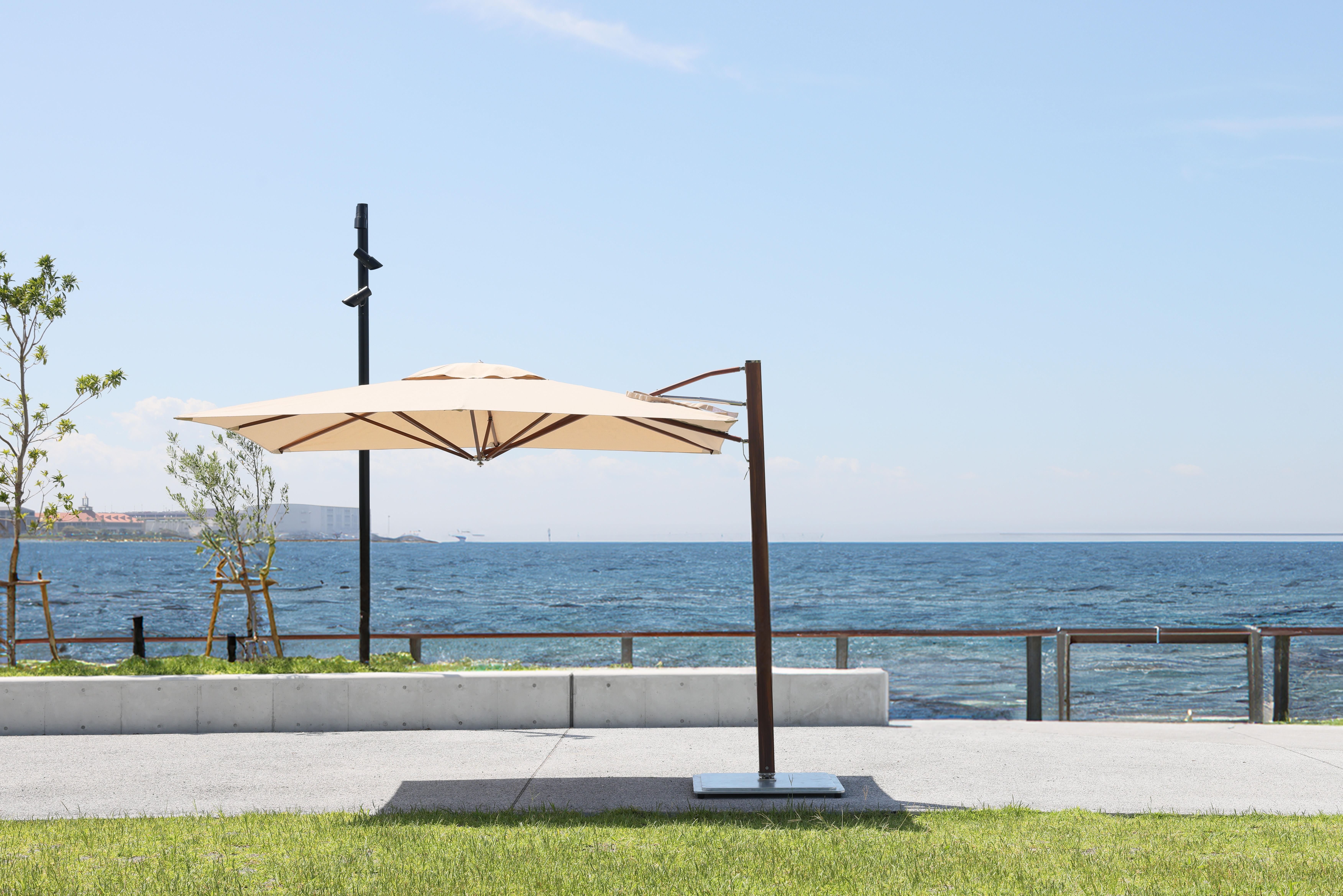 吊り下げタイプで支柱が邪魔にならない特大スクエアパラソル。耐候性のあるサンブレラ生地使用。