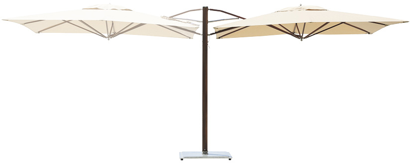 吊り下げタイプで支柱が邪魔にならない特大スクエアパラソル。対候性のあるサンブレラ生地使用。