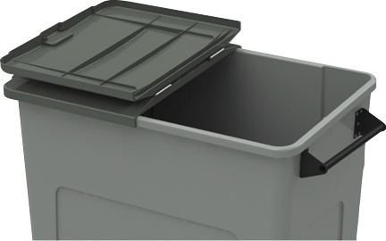 ポリエチレン、ハンドル:スチール製(黒亜鉛メッキ仕様)○ キャスター150φ4輪(固定輪2、ストッパー付き自在輪2)