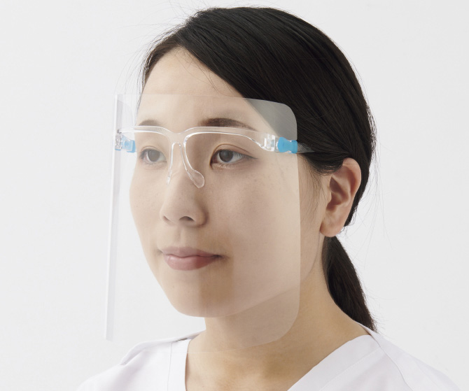 顔幅を選ばずメガネの上からも使用可能。取り替え自在のフェイスフレーム&シールド。