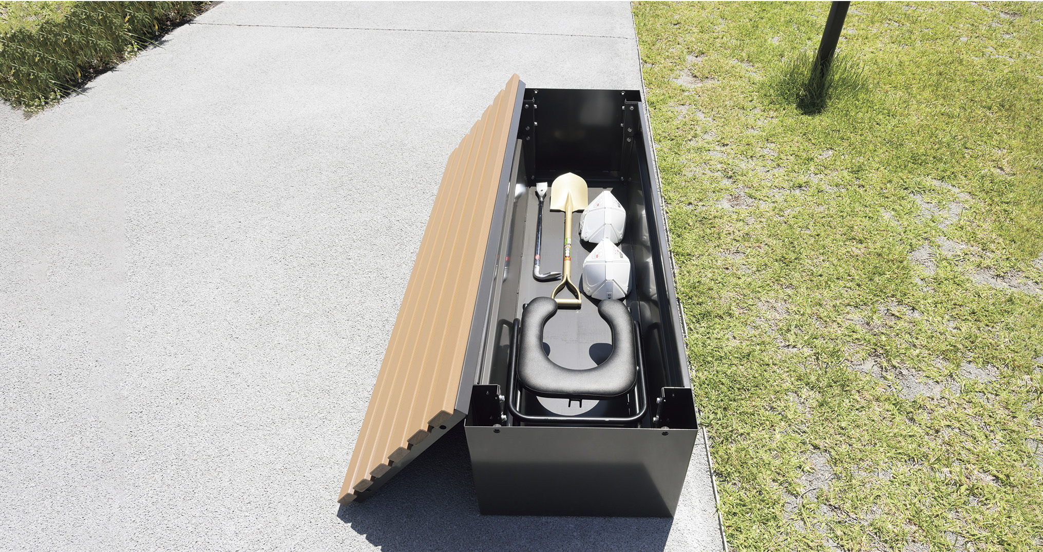 座れる、備える、もしもの時の頼れるベンチ。 災害発生時に必要なアイテムを収納保管できます。