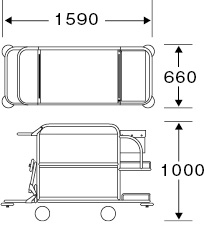 - 幅 660 ×奥行 1590 ×高さ 1000 mm 補助ハンドル・シーツストックをたたんだ時:660×1290×1000mm(キャスター・バンパー含む)布袋サイズ510×250×200mm